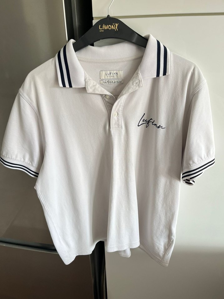 Erkek beyaz pamuklu polo tişört, düğmeli ve baskılı detaylara sahip. Rahat kesim, kısa kollu ve yakada çizgili detaylar bulunur. 1 kere giyildi