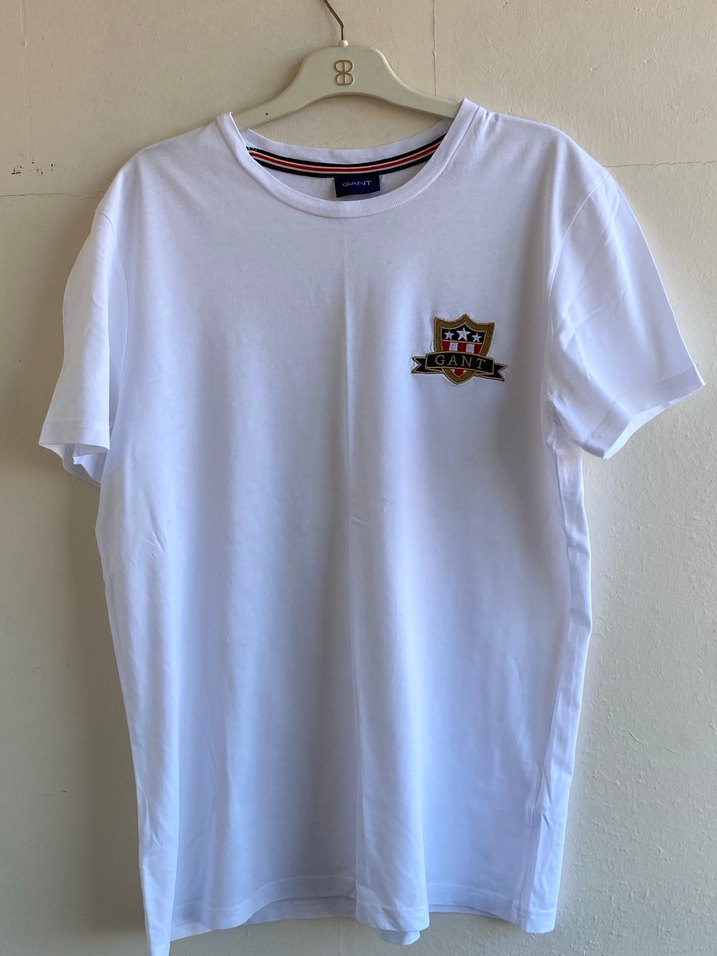 Beyaz pamuklu kısa kollu, bisiklet yaka tişört. Baskılı amblem detaylı, rahat kesim ve normal boyda, günlük sokak stili için uygun. Ufak arkasında kusuru var belli olmayan
