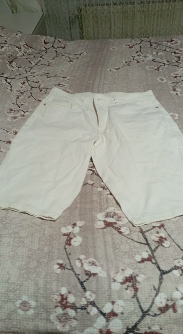 Erkekler için beyaz pamuklu, bol kesim mini şort. Günlük kullanım için rahat ve şık, sokak modasına uygun. sade durdugu için lekeler var ama yıkanınca çıkar şüpheniz olmasın