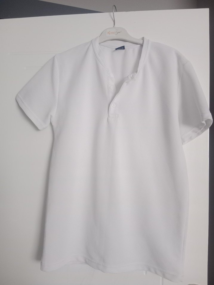 Erkekler için beyaz pamuklu polo tişört, kısa kollu ve yakalıdır. Rahat ve bol kesimiyle günlük sokak stiline uygundur.
