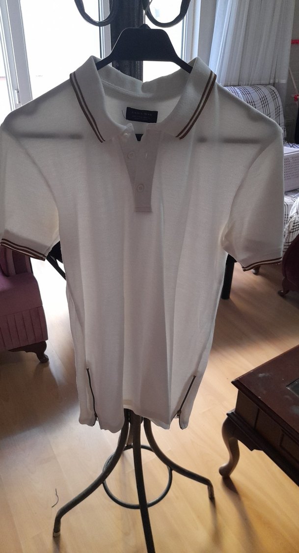 Erkek beyaz pamuklu polo tişört, kısa kollu, yuvarlak yaka ve bol kesimdir. Yaka ve kollarda çizgili detaylar ve düğmeli tasarımı vardır.