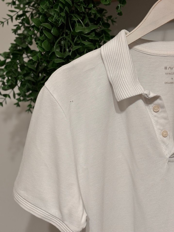 Beyaz renkli, pamuklu erkek polo tişört. Düğmeli yakası ve kısa kolları ile rahat, günlük sokak stili için uygun. Görselde kusuru gözüküyor
