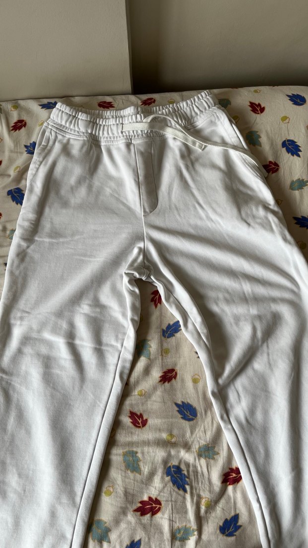 Beyaz pamuklu, salaş kesim ve midi boyda erkek eşofman altı. Trendy rahat sokak stili için uygun, günlük kullanımda konforlu ve zahmetsiz şıklık sağlar. cok az kullanıldı hiçbir defosu yoktur