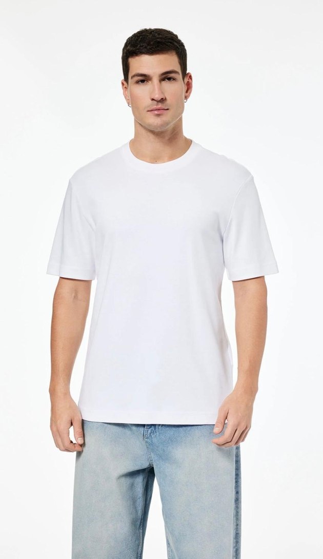 Erkekler için beyaz pamuklu tişört, salaş kesim, kısa kollu ve yuvarlak yakalıdır. Günlük kullanıma uygun rahat ve şık bir sokak stili sunar.