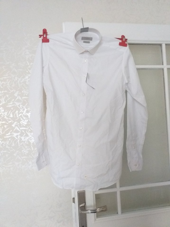 Pamuk kumaştan, düğmeli uzun kollu ve yakalı erkek beyaz gömlek. Normal kalıp ve midi uzunlukta, minimalist ve şık tasarım, günlük sokak modasına uygun. yeni ambalajlıydı ufak bi sandık lekesi var muhtemelen çıkar