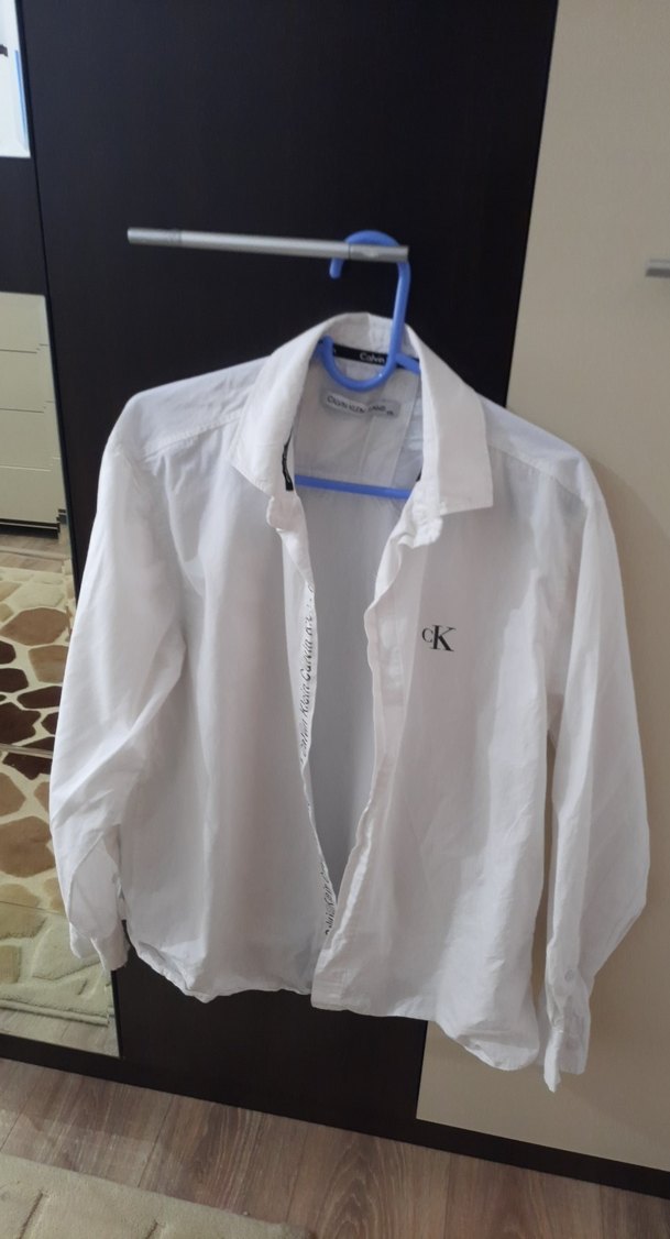 Erkek beyaz pamuklu gömlek, uzun kollu ve yakalıdır. Düğmeli ve bol kesimdir, 'cK' logosu vardır, günlük rahat stil için uygundur.