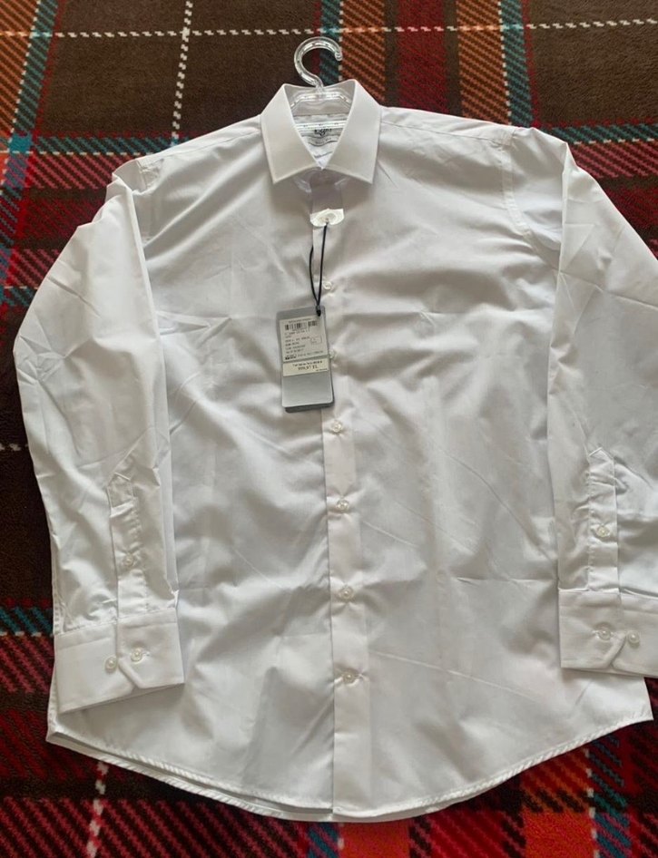 Pamuklu kumaştan yapılmış, uzun kollu, yakalı ve düğmeli önlü erkek beyaz gömlek. Ofis kullanımı için uygun sade tasarım.