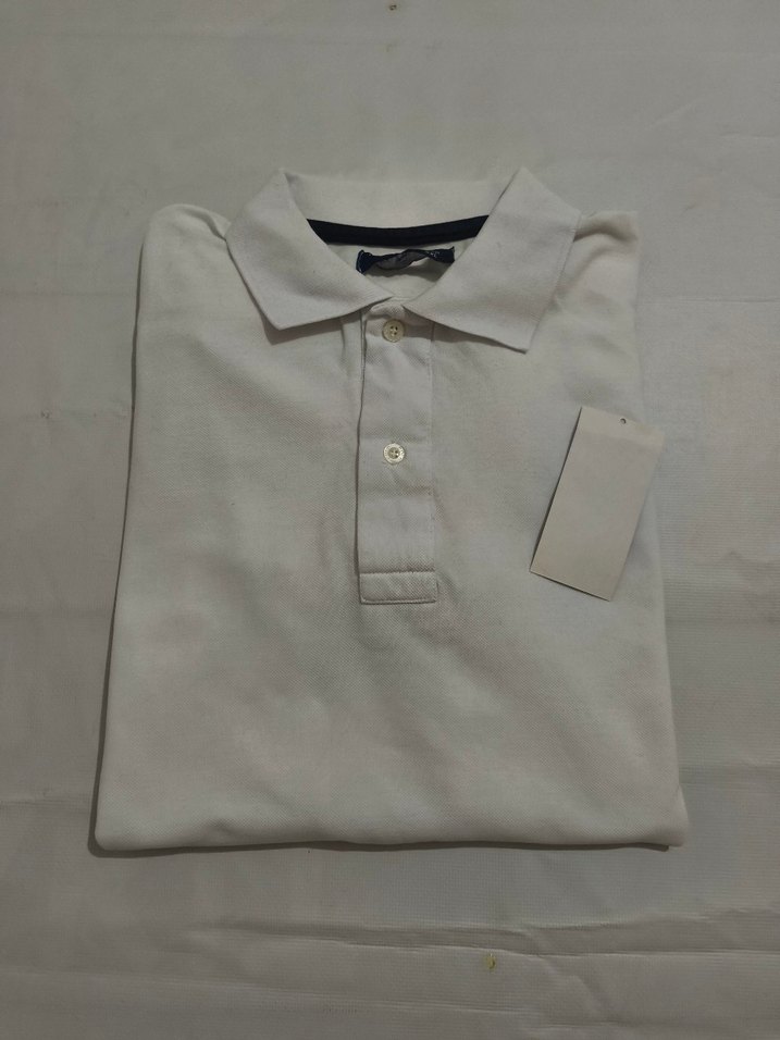 Erkekler için beyaz polo tişört, kısa kollu ve yakalıdır. Düğmeli ön kısmı ve yumuşak sentetik kumaşı ile günlük rahat kullanım için uygundur.
