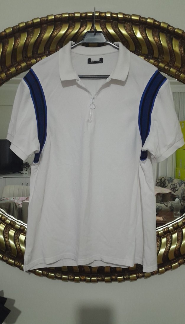 iki koltuk altı genişliği 55cm, uzunluk 70 cm.detaylı, kısa kollu beyaz erkek polo yaka tişört.,fermuarlı , günlük sokak stili için uygun.
