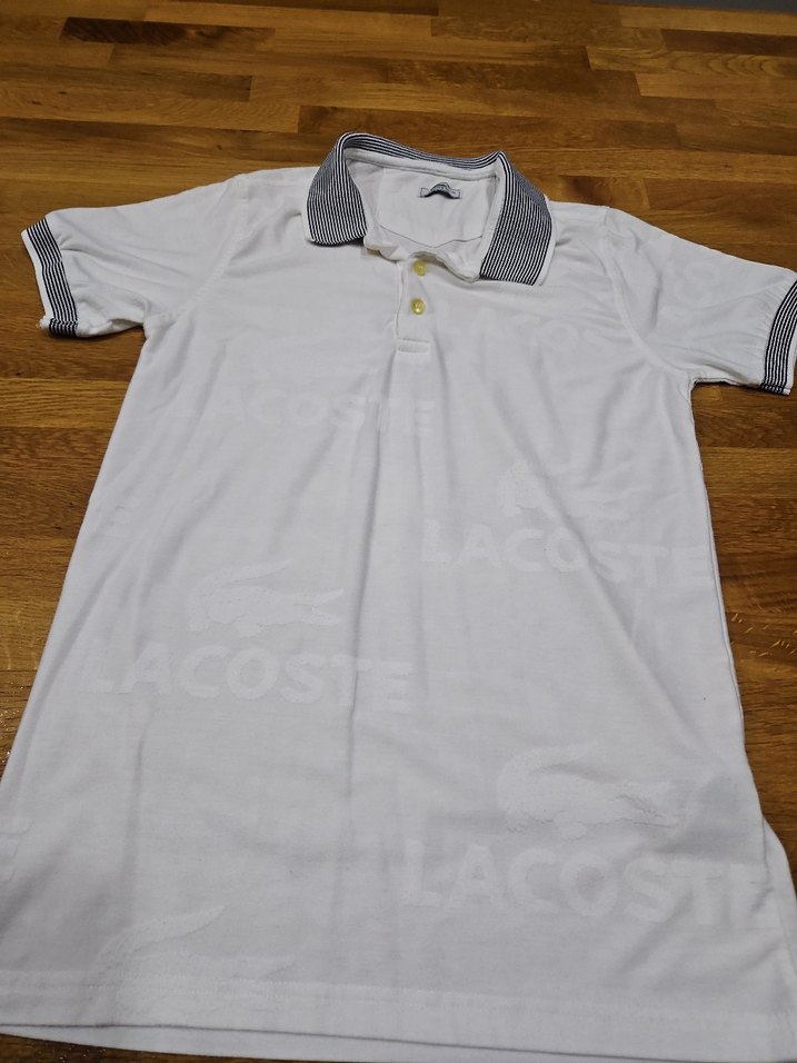 Kısa kollu, düğmeli erkek beyaz polo yaka tişört. Yaka ve kol uçlarında gri detaylar bulunur. Yumuşak sentetik kumaştan, baskılı desenlidir. göğüs 45 uzunluk 65 cm kol boyu 20 cm kol genişliği 13 cm