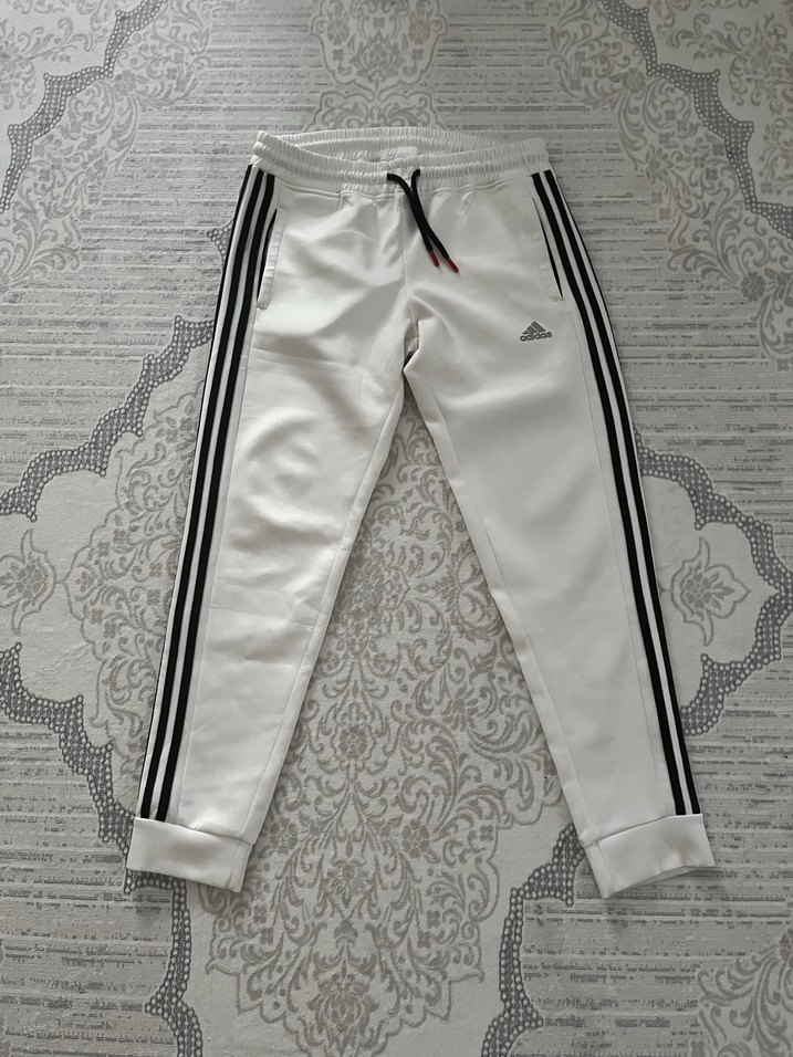 Siyah yan şeritler ve bağcıklı beliyle beyaz, rahat kesim erkek spor eşofman altı, yumuşak sentetik kumaştan, spor ve sokak stili için uygun. ♂️