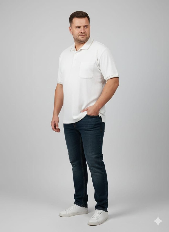 Erkekler için beyaz polo tişört, kısa kollu ve yuvarlak yaka. Denim kumaştan üretilmiş, regular fit ve göğüs cebine sahip, gündelik stil için uygun.