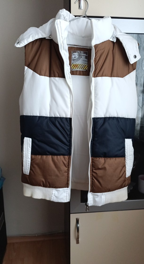 Erkekler için fermuarlı ve kolu olmayan yelek. Beyaz, kahverengi ve siyah renkleriyle sokak stilini yansıtıyor. Yumuşak ve sıcak kumaştan üretilmiştir. Kapşonlu