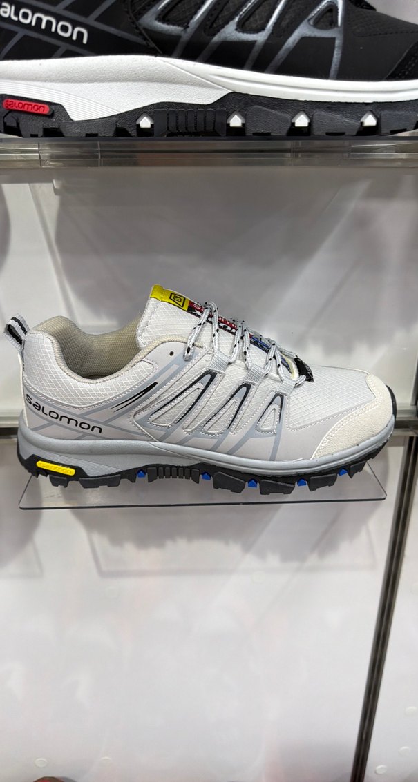 Salomon marka erkek beyaz ve gri baskılı, bağcıklı outdoor spor ayakkabısı. Kauçuk taban dayanıklı ve sportif kullanım için uygun.