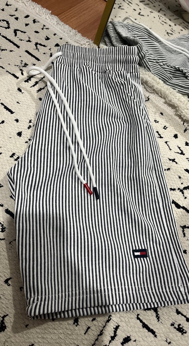 Erkekler için beyaz siyah çizgili, bol kesim, pliseli mini şort. İpli bel kısmı ve rahat sokak stili bulunur. Pazarlık kabul