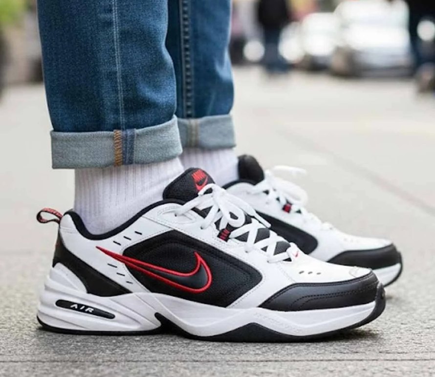 Erkekler için beyaz siyah spor ayakkabı, bağcıklı ve kauçuk tabanlı, kırmızı detaylar ve sportif tasarımla. Günlük ve sokak stili için uygun. Nike