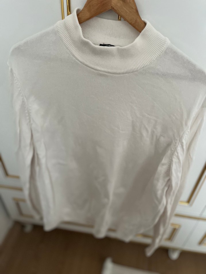 Kadınlar için beyaz boğazlı, uzun kollu keten kumaştan yapılmış, bol kesim ve normal midi boyunda sade kazak. Ürün sıfır kullanılmadı baza altında sarılaşmış yıkanınca çıkar bence alan ona göre alsın uygun koyuyorum