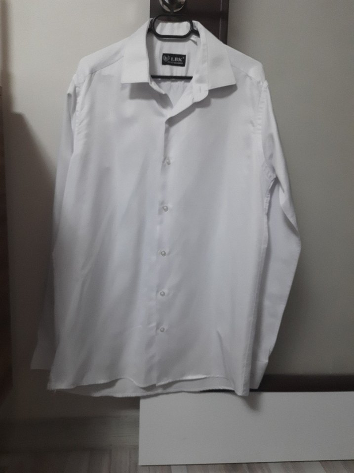 Erkekler için yakalı, uzun kollu, düğmeli beyaz gömlek. Normal midi boyda, düz ve iş ortamına uygun sentetik kumaştan üretilmiştir.