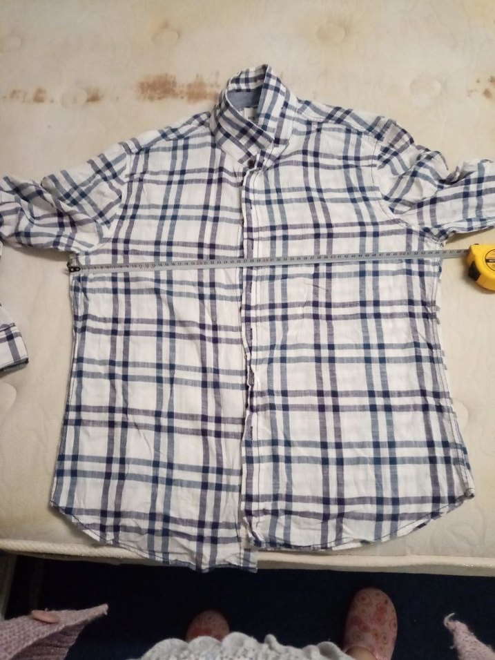 Beyaz erkek keten gömlek, uzun kollu, düğmeli ve yakalıdır. Rahat kesim ve kareli desene sahiptir, günlük sokak stili için uygundur. ölçüler fotoğraflarda vardır temizdir herhangi bir sorunu yoktur XL bedendir