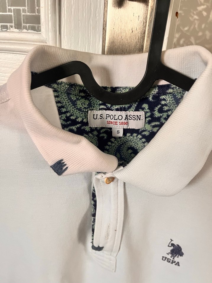 Pamuk kumaştan üretilmiş, düğmeli yakalı, baskılı detaylara sahip beyaz uzun kollu, dar kesim erkek polo tişört. U.S.POLOASSN etiketi bulunur.