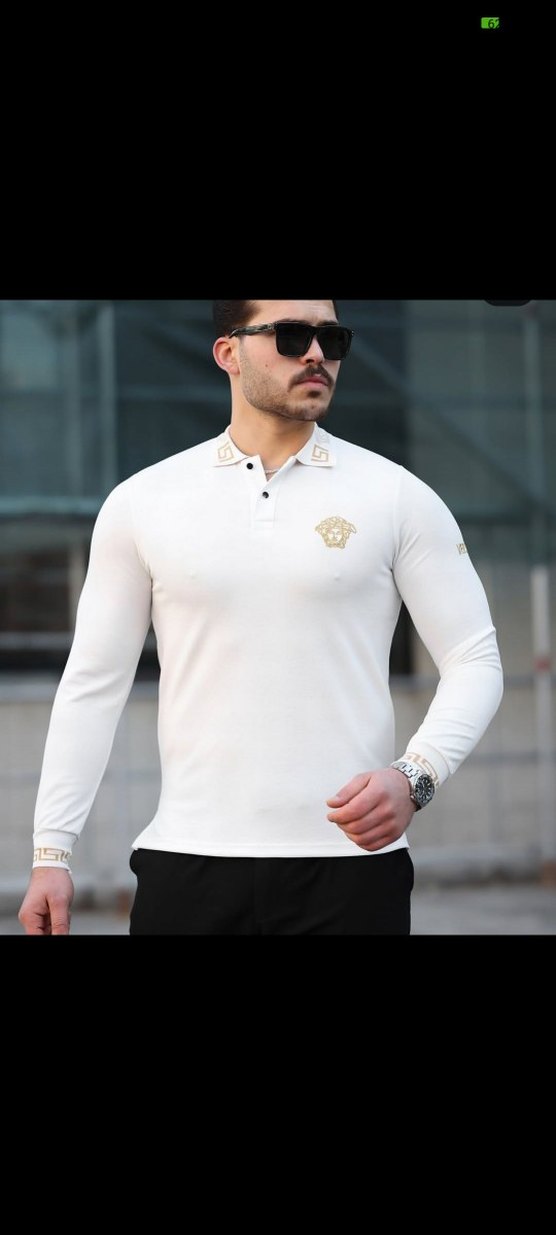 Erkekler için beyaz, uzun kollu, düğmeli polo yaka tişört. Baskılı detayları ve rahat kesimiyle günlük kullanıma uygundur. ✨