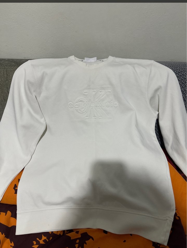 Erkek beyaz uzun kollu sweatshirt, yuvarlak yaka ve bol kesimlidir. Yumuşak ve sıcak kumaştan üretilmiş, günlük rahat kullanım için uygundur.