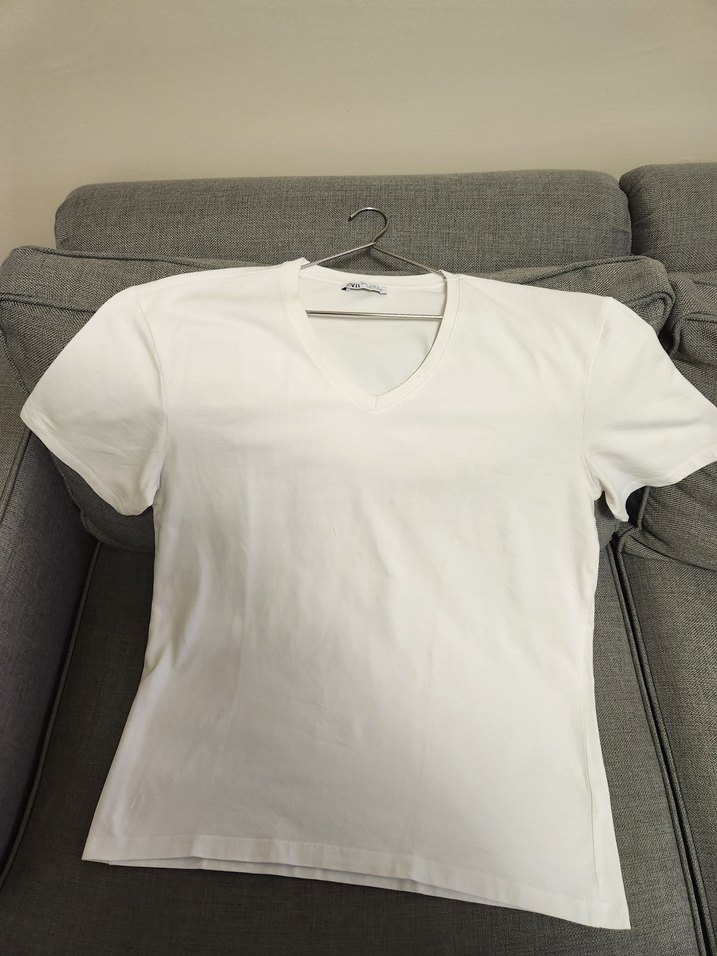 ERKEK Beyaz V Yaka Kısa Kollu Pamuk ZARA Tişört