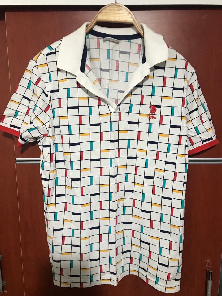 Erkek polo tişört, V yaka, kısa kollu ve renkli çizgili baskıya sahip. Regular fit, düğmeli ve sentetik kumaştan üretilmiş, beyaz zemin üzerinde kırmızı USPA logosu bulunur.