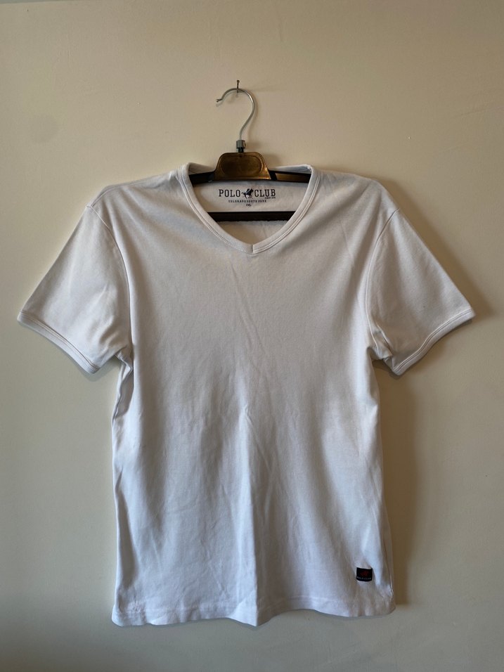 Fitted kesim, beyaz V yakalı erkek polo tişört. Yumuşak pamuk kumaştan, deseniz sade, günlük sokak stili için uygun. Etiket üzerinde POLOCLDE yazıyor.