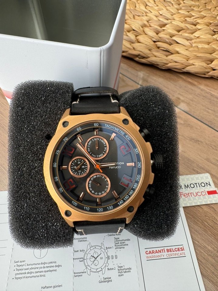 Erkek biker tarzı saat, koyu kadran ve altın detaylarla. Çoklu kronograf alt kadranlar, siyah deri kayış ve takimetre içerir. Garanti belgesi ile birlikte. ⌚