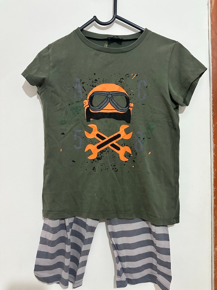 Erkek için biker temalı, kısa kollu, bisiklet yaka haki üst ve gri çizgili şorttan oluşan sentetik kumaş takımı. ️