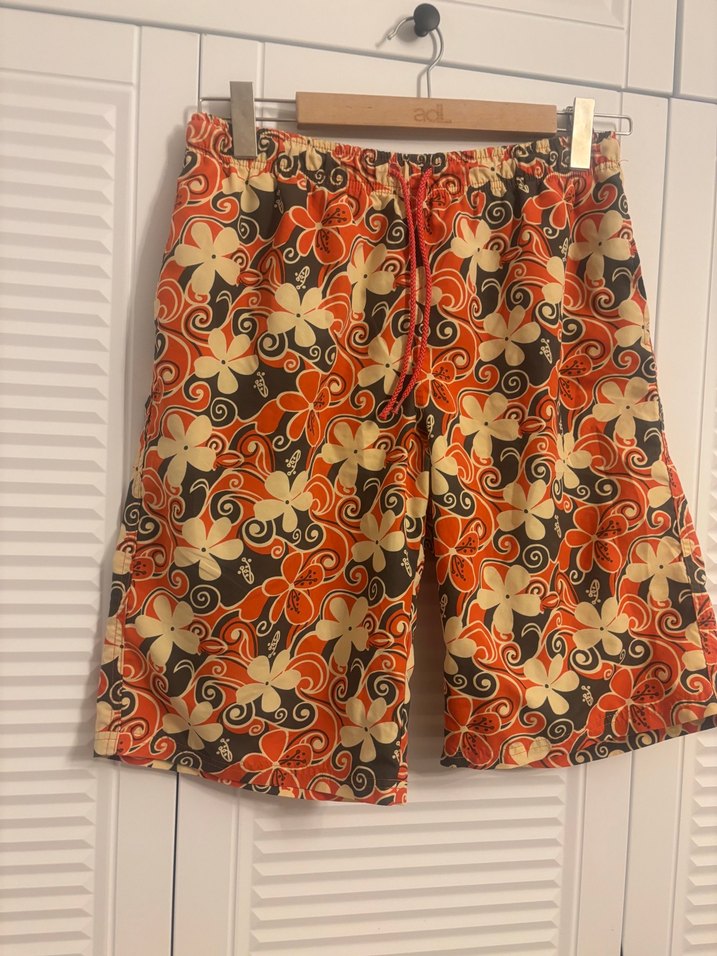 Erkekler için bol kesim, midi boy, bağcıklı ve çiçek desenli bohem mayo şort. Düğmeli detaylı, plaj için uygun. Mayo şort içi fileli üç adet cebi var bel L beden bel lastikli esnetilmeden 40 cm 52 cm ye kadar esniyor boy 56 cm sayılı kullanıldı yeniden farksız tıffany marka