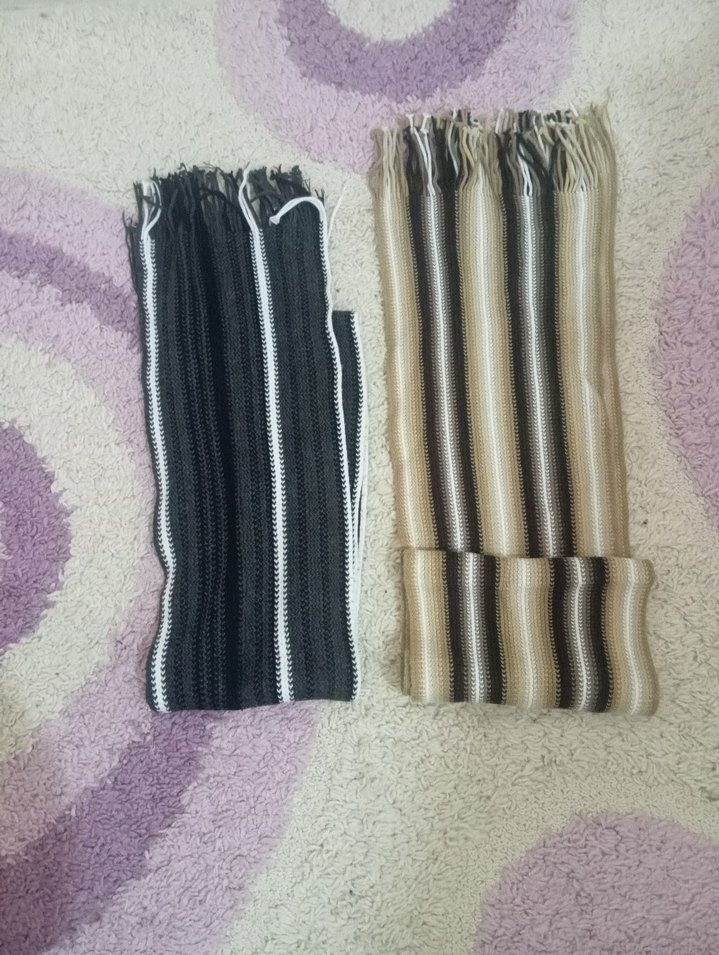 Gri ve bej tonlarında çizgili desenlere sahip, uzun ve bohem tarzda iki adet erkek atkısı seti. Rahat ve trend bir görünüm sunar.