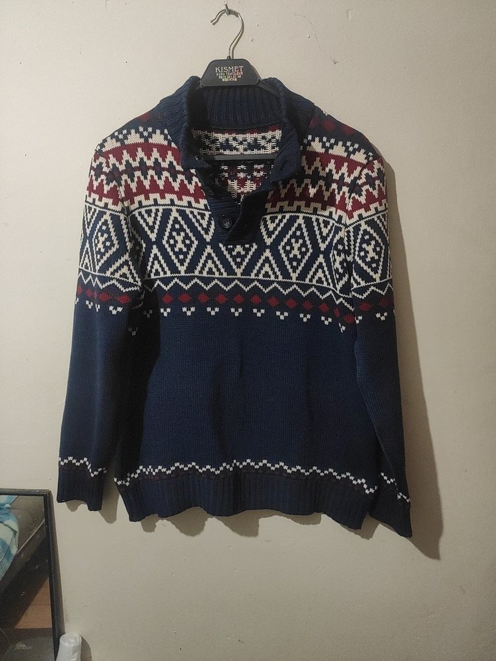 Erkek için yüksek yakalı, uzun kollu, bol kesim örgü kazak. Koyu renkli çok desenli bohem tarzda tasarlanmıştır.