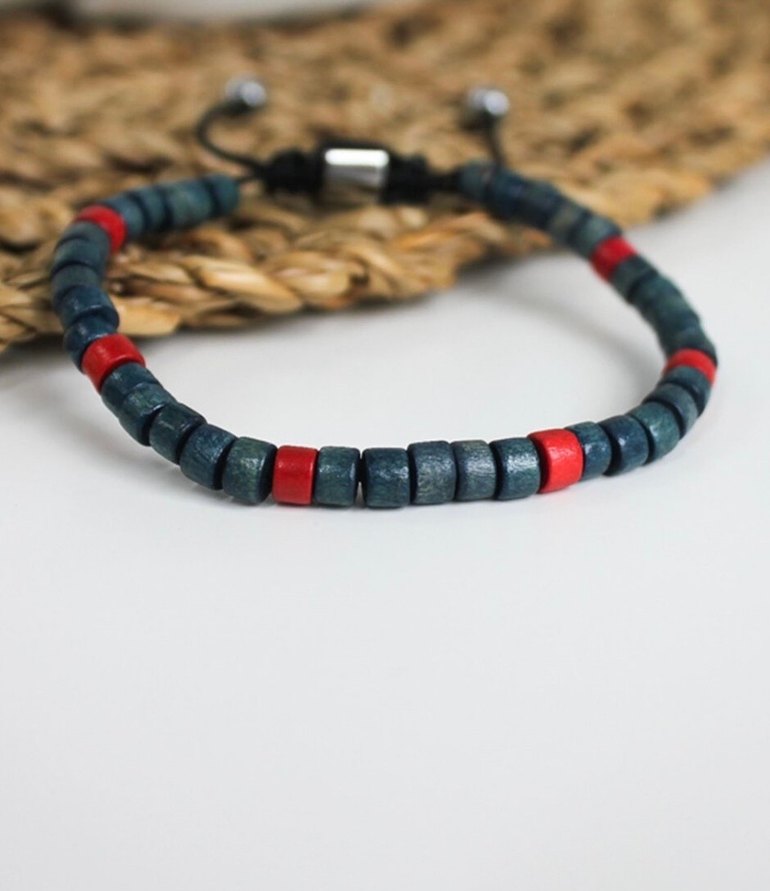 Erkekler için bohem tarzda, koyu ve kırmızı tonlarda renkli boncuklardan oluşan, ipli ayarlanabilir bileklik.