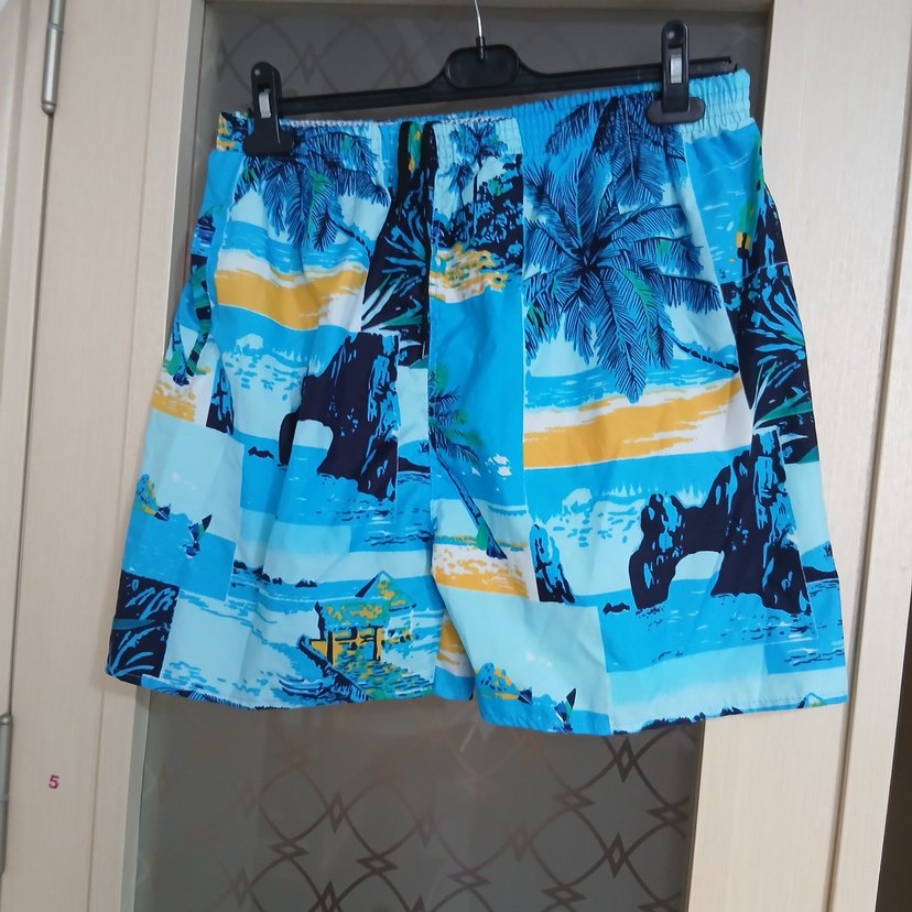 Gevşek kesim erkek yüzme şortu, tropikal palmiye ve plaj desenli renkli batik baskıya sahiptir, sokak modasına uygundur.