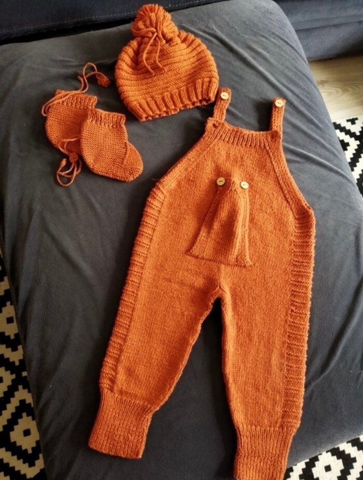 Bohem tarzda, kahverengi örgü, askılı bol kesim erkek tulumu, uyumlu şapka ve patik ile birlikte.