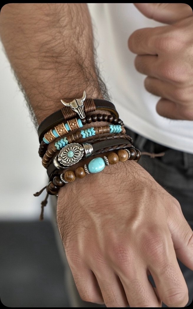 Turkuaz boncuklar ve koyu kahverengi detaylar içeren, bohem tarzı erkek bileklik seti. Boğa kafası ve detaylı gümüş süslemeler bulunur.