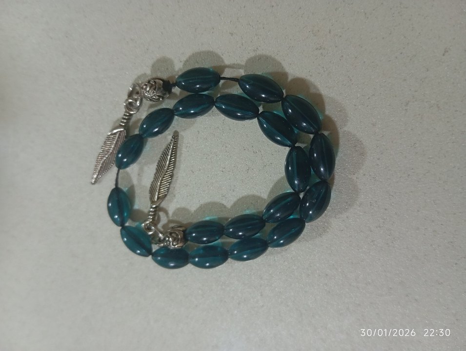 Erkekler için koyu turkuaz oval boncuklardan oluşan, gümüş tüy şeklinde aksesuarlar taşıyan bohem tarzı tesbih. geri iadesi yoktur