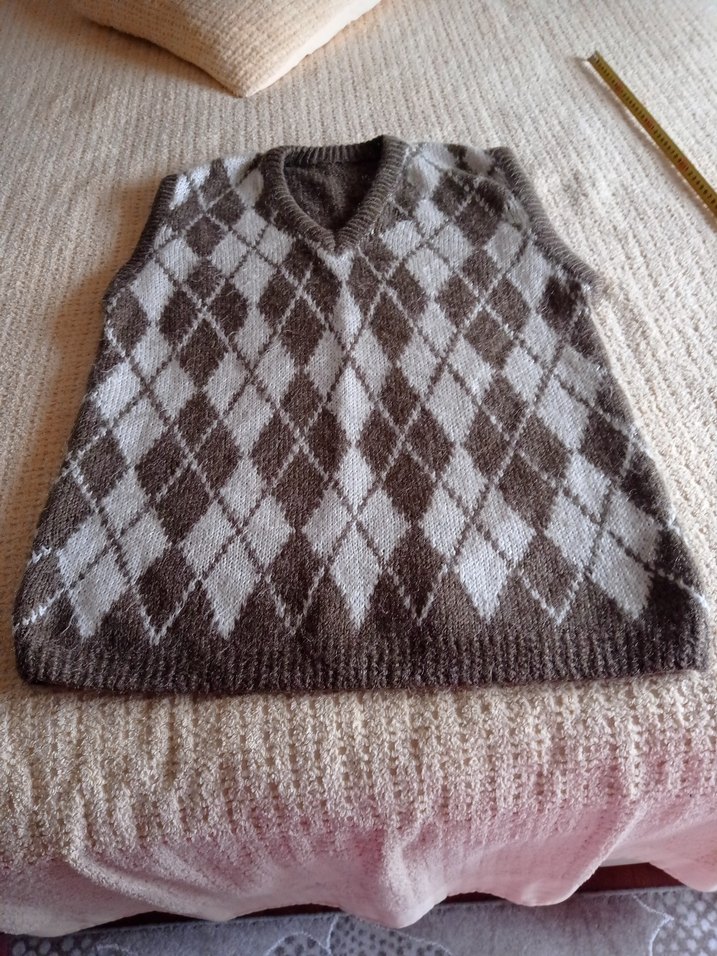 Erkek için kolsuz, bol kesim ve V yaka tasarımlı süveter. Kahverengi ve gri argyle desenli örgü, bohem tarzda.