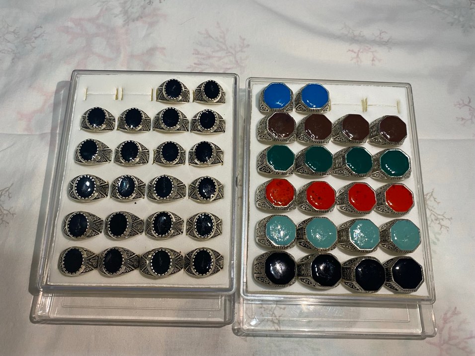 Erkekler için çok renkli taşlı, vintage bohem tarzda gümüş görünümlü yüzükler seti. Retro ve hippie stiline uygun.