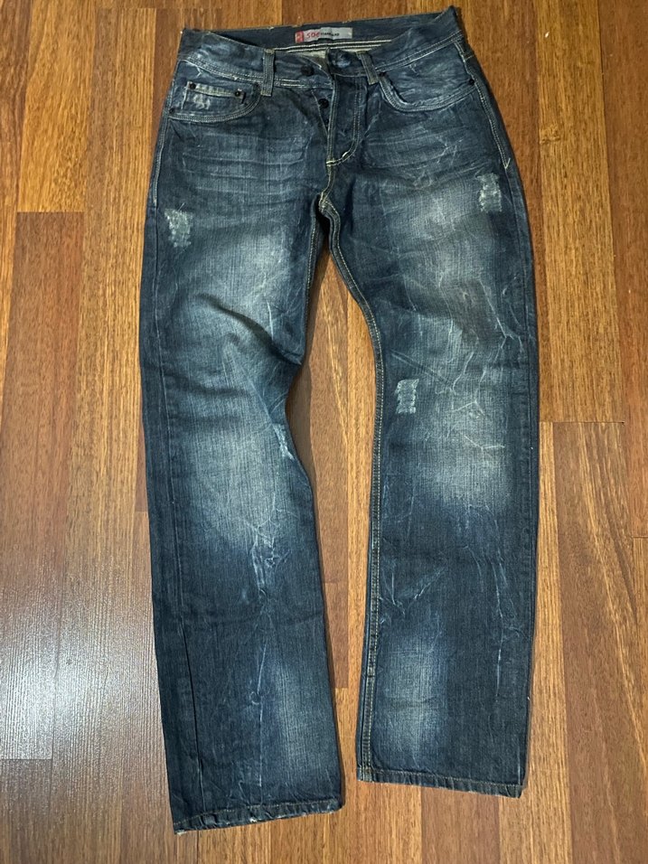 Erkekler için dayanıklı denimden yapılmış, bol kesim ve normal boyda kot pantolon. Günlük sokak stili için uygun, koyu renk ve hafif yıpranmış görünüme sahip.
