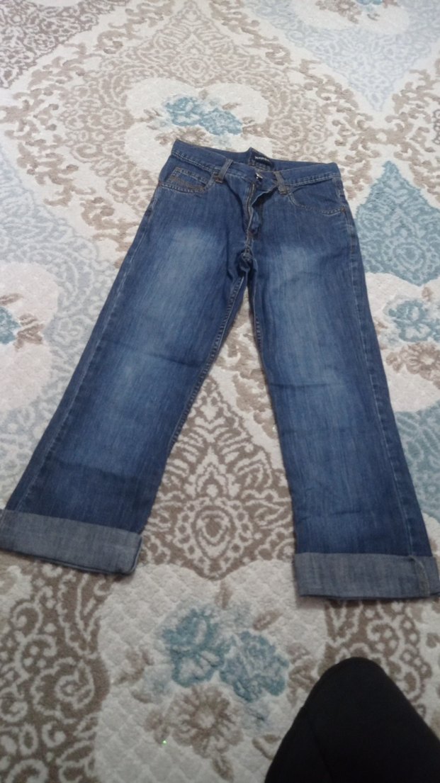 Bol kesim mavi denim kot pantolon, kemerli ve normal boyda, günlük sokak tarzına uygun.