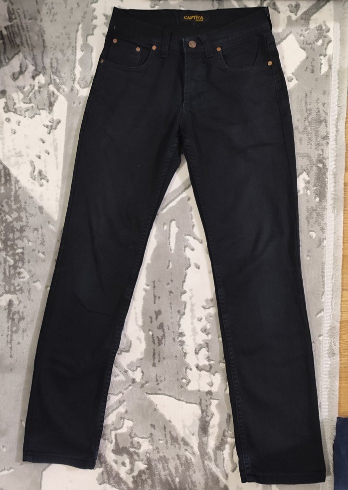 Düğmeli siyah erkek denim pantolon, regular fit ve normal boyda. Günlük kullanım için uygun, streetwear tarzında. boy 100 bel 37 en alt paca 17 kullanilmadi sadece etiketi koparilmis