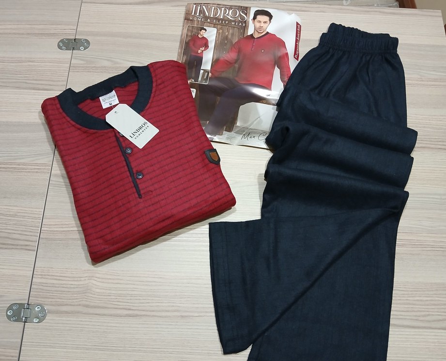 Bordo renkli uzub kollu, düğmeli ve yuvarlak yakalı üst ile koyu renk pantolondan oluşan erkek pijama takımı. Rahat ve şık bir seçenek. BEDENLER M L XL 2XL