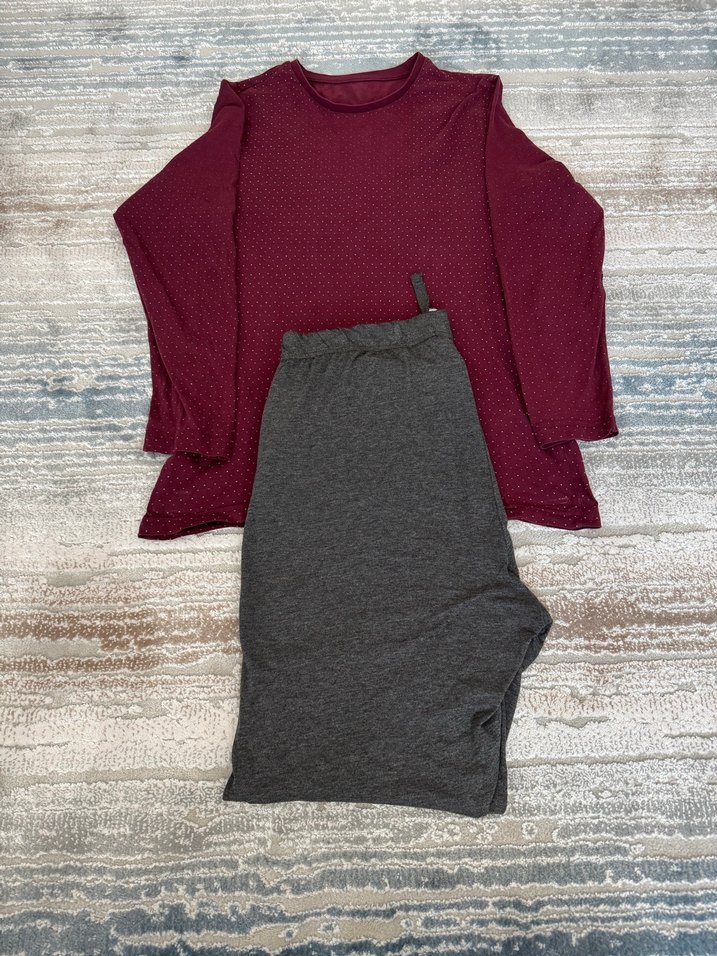 Bordo uzun kollu üst ve gri midi boy alt pantolonlu, bol kesim kadın pijama takımı. Yumuşak ve rahat kumaştan üretilmiştir. Tertemiz ihtiyaç fazlası