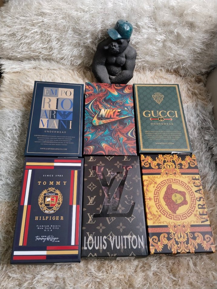Gucci, Louis Vuitton, Nike, Tommy Hilfiger, Emporio Armani ve Versace tasarımlı defter seti.