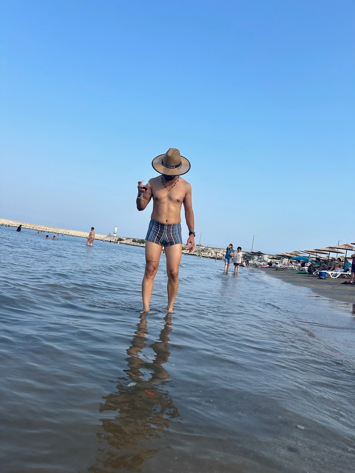 Hafif camel renkli, bağlama desenli, bohem tarzda, sıkı kesim mini erkek mayo, plaj için rahat ve şık. ️