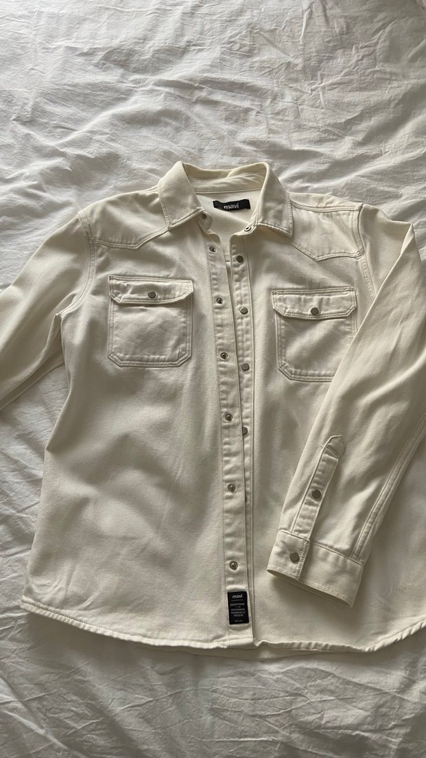 Düğmeli ön cep detaylı, keten kumaştan, uzun kollu, beyaz, bol kesim gömlek. Notched lapel yaka ve günlük sokak tarzı.