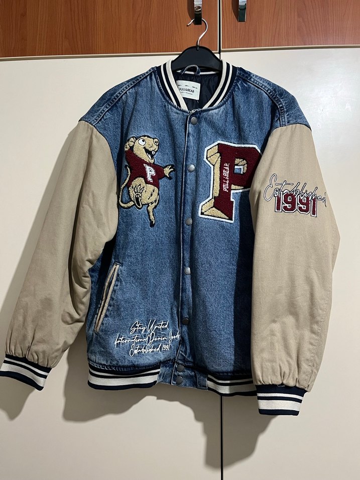 Bol kesim erkek bomber ceket, denim gövde ve bej uzun kollu. Düğmeli, baskılı patch detaylı, çizgili ribana manşetli, günlük sokak stili için uygun.